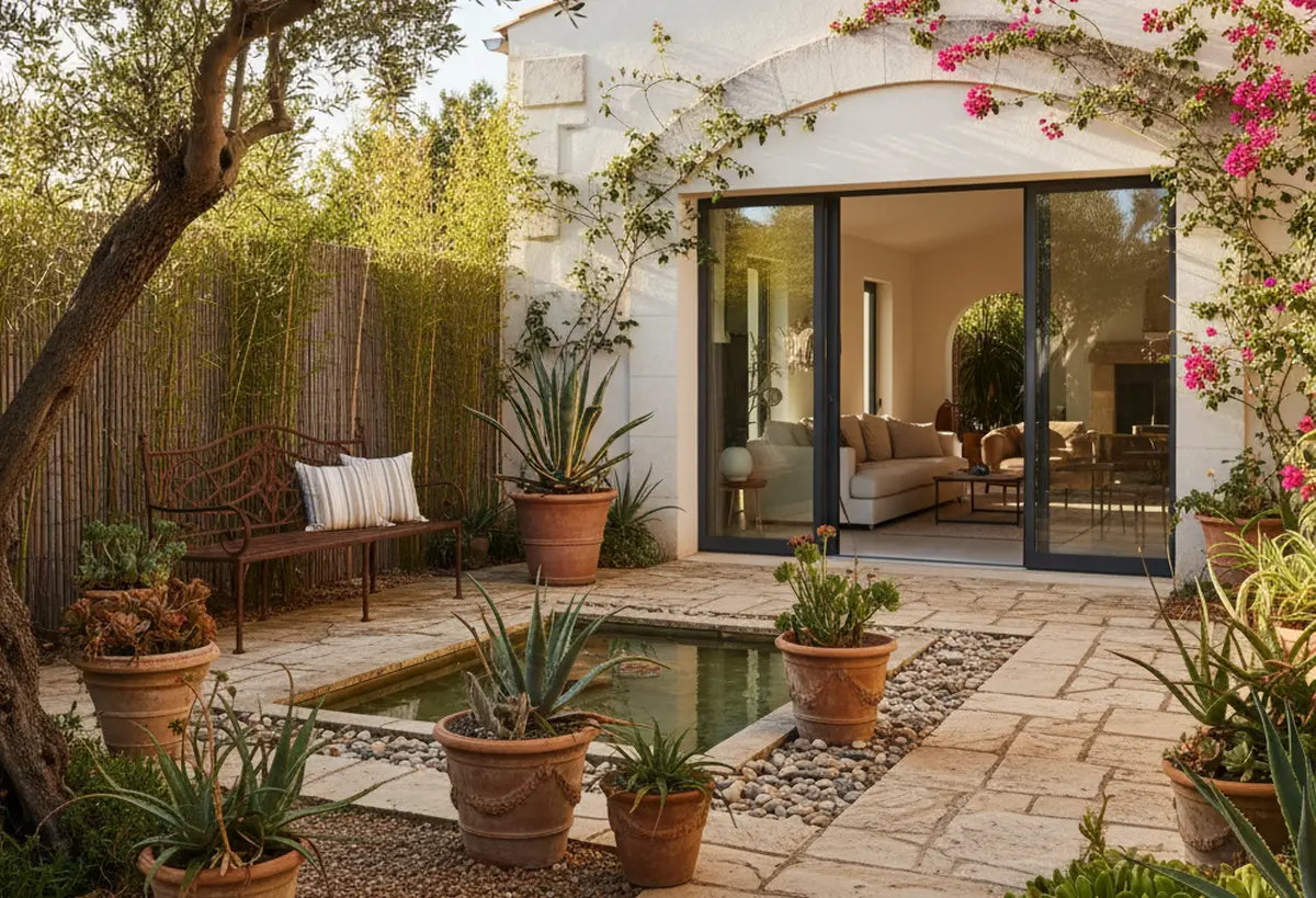 Des feuillages volumineux, même artificiels de haute qualité, recréent une atmosphère exotique sans arrosage excessif. Des palmiers nains, des fougères et des bananiers ornementaux s’associent à des voiles d’ombrage légers. Les couleurs vives mais naturelles comme le vert profond et le jaune ocre renforcent cette immersion.