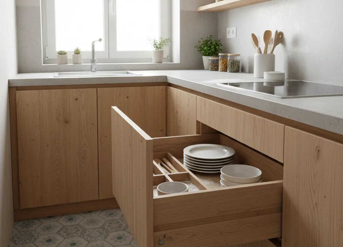 L’angle mort devient un atout majeur dans un rangement petite cuisine 4m2. Les systèmes pivotants ou les tiroirs d’angle coulissants transforment cet espace perdu en zone de rangement très pratique.